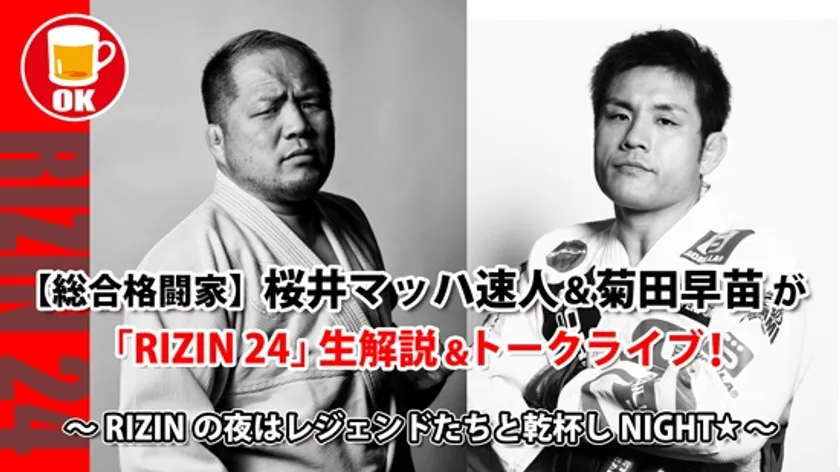 日本の総合格闘技界を黎明期から牽引してきた、総合格闘技界のWレジェンド「野生のカリスマ」こと桜井マッハ速人と、「寝技キング」菊田早苗がRIZIN 24の夜、オンラインスタジオで大暴れ!指導者としても活躍するふたりがRIZIN 24の各試合を観ながらあらゆる視点で分析!参加者のみなさんと楽しく交流しながら、ディープかつハチャメチャ(!?)なトークを繰り広げます。オンラインだから、飲食自由!アルコールOK!どこからでも参加可能です!