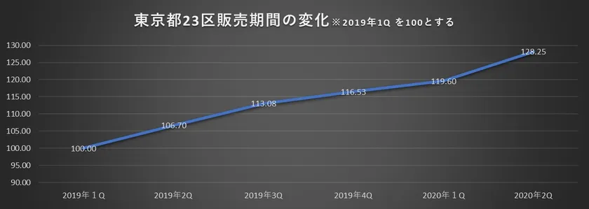 東京都23区全域における2020年第一・第二四半期の中古不動産販売期間は昨年同月比で平均19.01%の長期化が見られました。長期化の傾向は、2019年10月前後から起こり始め2020年第二四半期まで続いています。これは、消費税増税にコロナ禍が輪をかけ、経済的な要因で購買需要を減速させているからと考えられます。(※購買需要が減少すると、各物件に対する購入客が減少する為、売却の機会も減少し、その分販売期間が長期化する。)