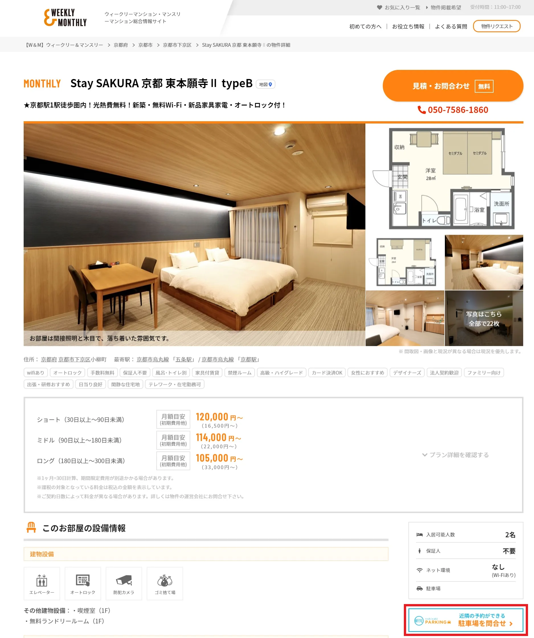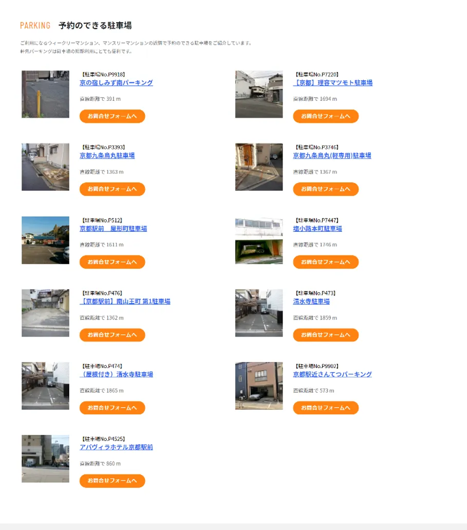 今回のサービス連携により、「W&M(ウィークリー&マンスリー)」サイト上で併設の駐車場がない物件には、リンクボタンから近隣の「軒先パーキング」に掲載されている駐車場が表示され、長期利用の問合せが簡単にできるようになります。