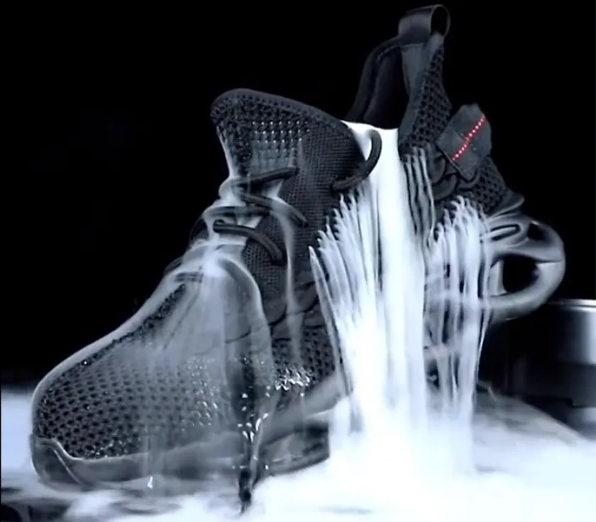 靴の中に入れたドライアイスが靴全体からこぼれ通気性が良好であることを証明しています。