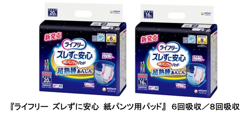 ユニ・チャーム株式会社(本社:東京都港区、代表取締役 社長執行役員:高原豪久)は、大人用紙おむつとしてお客様に高くご支持を頂いている『ライフリー』より、夜間に横向きの寝姿勢でもモレを防ぎ、一晩中安心して熟睡できる紙パンツ用のパッド『ライフリー ズレずに安心 紙パンツ用パッド』6回吸収と8回吸収を、2020年10月6日に全国で発売します。
