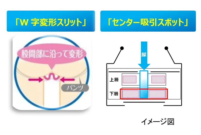 ・「センター吸引スポット」で多量尿も素早く吸収し拡散するのでモレずに安心。