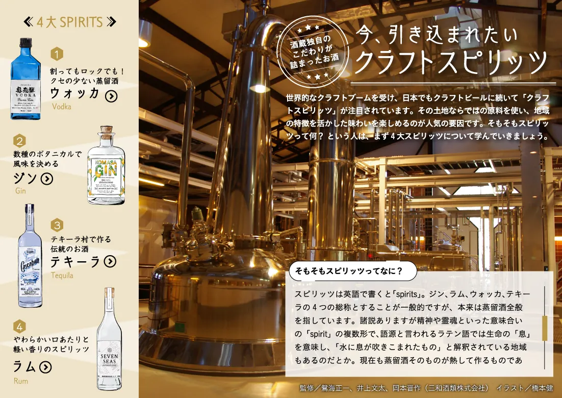 世界的なクラフトブルワリーブームから、クラフトビールに続いて注目されている「クラフトスピリッツ」。基本の4大スピリッツの解説から、その土地ならではの原料を使い地域の特徴を活かした味わいを楽しめる和製クラフトスピリッツの紹介まで、幅広く学べます。モデルで人気料理家の和田明日香さんが作る、クラフトスピリッツに合わせたい「缶つま」アレンジおつまみレシピも。