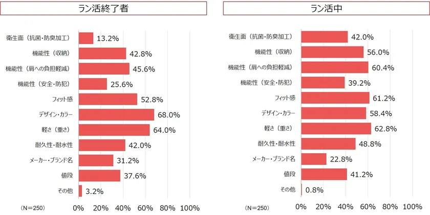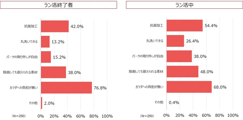 一方、『衛生面(抗菌・防臭加工)』に焦点を当てると、ラン活終了組は1割程度に対し、現在ラン活組の約4割が選択していることから、感染拡大の影響もあり『衛生面』についても意識するようになったことが伺えます。