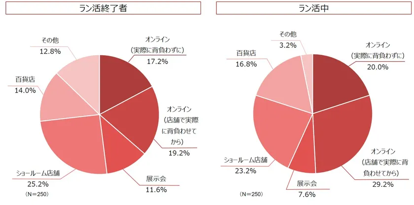 (3) 約9割が「実際に背負わせてから決めたい」と回答しているにも関わらず、実際は、現在ラン活組の約半数がオンラインで約2割が実際に背負わずに購入予定!