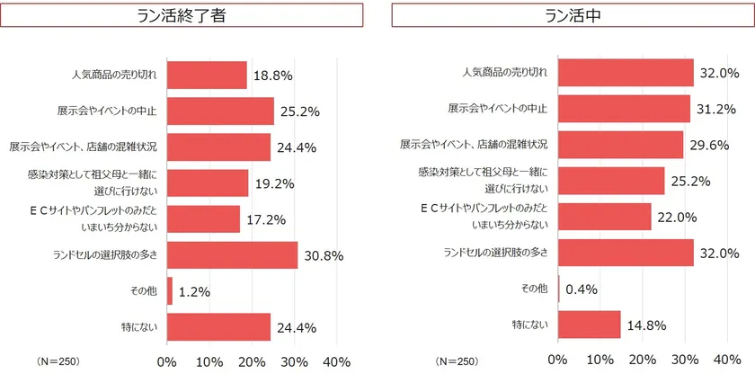 次いで、「イベントや展示会の中止」(ラン活終了組/25.2%、現在ラン活組/31.2%)と、コロナ禍ならではの悩みが浮き彫りになりました。