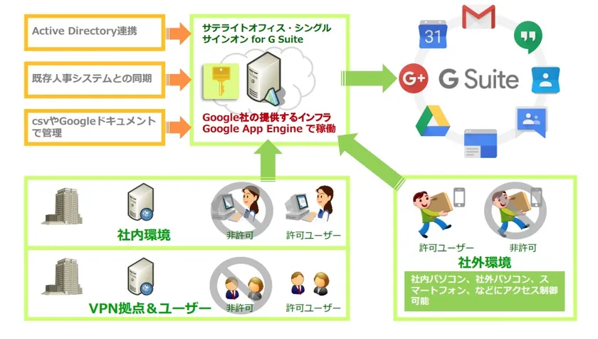 サテライトオフィスは、Google Cloud(TM) プレミア パートナーであり、G Suite の販売代理店です。当社は、G Suite 導入支援の中で、G Suite で利用可能なシングルサインオン機能、AD連携機能、ワークフロー機能、掲示板/回覧板機能、組織カレンダー機能、組織アドレス帳機能、CRM機能等を無償/有償提供しております。シングルサインオン機能では、これまで、LINE WORKS、Office365、Workplace by Facebook、Salesforce、Dropbox Business、Box、Chatwork、AWS、Amazonビジネス、Slack、サイボウズガルーン/キントーン、デスクネッツNEOなどのクラウドサービスと幅広く連携しているほか、SAML対応されているアプリケーションはすべて連携可能となっています。今回は、株式会社ダイレクトクラウド(本社:東京)が提供する法人向けクラウドストレージ「DirectCloud-BOX」と連携しました。