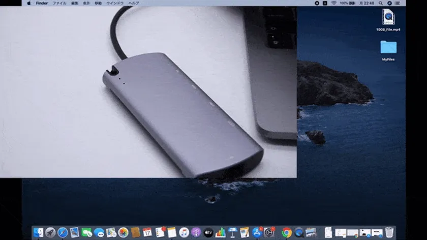 本USBハブの内蔵ストレージであるSSDは高速なデータ転送(読み込み420MB/S、書込み370MB/S)が可能。例えば、10GBの動画ファイルなどGBサイズのファイルでも20秒強で転送が完了します。このため、ファイルサイズが大きくなりがちな動画編集作業もストレスフリーで行うことが出来ます。