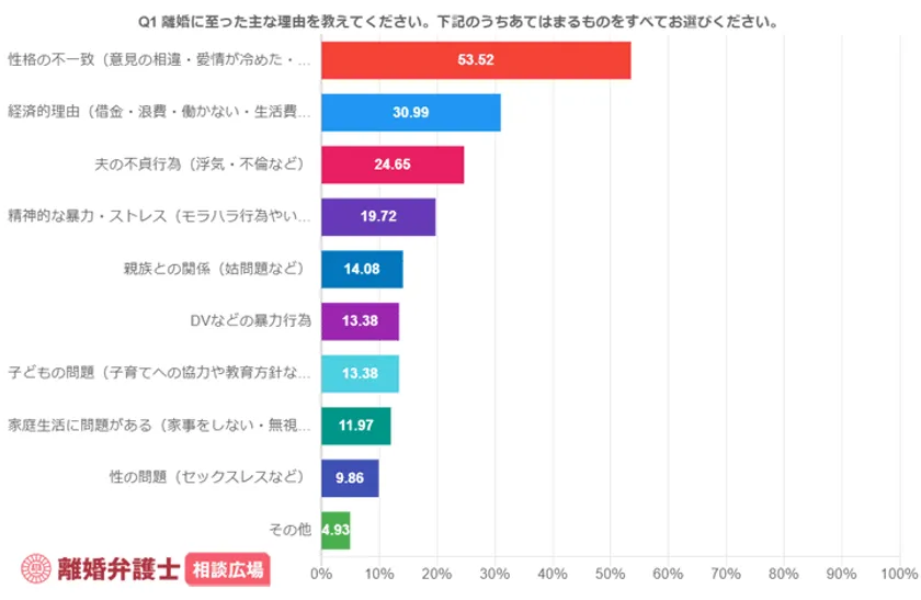 今回のアンケートで離婚理由の1位となったのは「性格の不一致(意見の相違・愛情が冷めた・一緒にいたくない)」(53.52%)。回答者の半数以上が離婚理由に挙げており、2位を20ポイント以上を引き離してトップとなりました。