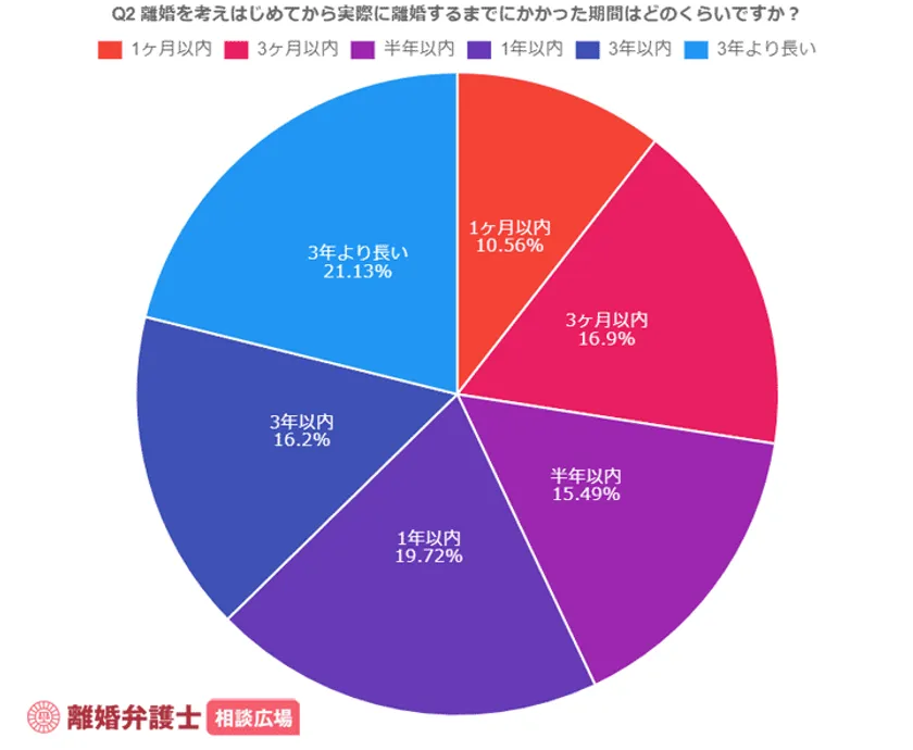 離婚を考えはじめてから実際に離婚するまでにどのくらいかかったか、離婚の検討期間の調査では、「3年より長い」(21.13%)がトップとなりました。