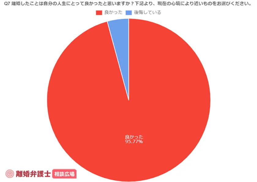 離婚したことに対する満足度の調査に対しては、95.77%の方が「離婚して良かった」と回答しました。離婚を経験した大多数の方は、自らの離婚の決断を肯定的に捉え、納得感を持って生活している様子が伺えます。