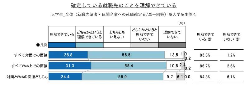 新型コロナウイルス感染症に伴う緊急事態宣言の影響で、今年の就職活動は様変わりしました。今まで主流だった対面の面接に代わってWeb面接も多くなり、学生の多くが、不慣れなWeb面接に不安を感じながら就職活動をしていました。10月に内定式を予定している企業も多くありますが、「Web面接で直接会えていないから、企業のことが理解できていないのではないかと不安」という学生の声や、企業からは「Web選考のみだったため、動機づけが不十分な気がする」といった声も聞かれています。では本当に面接形式によって学生の企業への理解度は変化するのでしょうか。 9月1日時点で就職先が確定している2021年卒の学生に「確定している就職先のことを理解できているか」を聴取しました。その結果、面接形式が「すべて対面」「すべてWeb」「対面とWeb」のいずれの場合でも、「理解できている・計」が80%を超えました。企業への理解度について不安視されているWeb面接ですが、実際のところ大きな差はないと言えます。企業への理解度は、対面、Webという形式よりも、学生にどのような情報提供の場を設けたかで変化します。理解度別に情報接点を見ると、「理解している」 学生の方がより「内定者懇親会」「社員との懇親会」を経験していることがわかりました。企業は対面、Webなどの検討もさることながら、学生を理解し、また自社を理解してもらうために、いつ誰から何を伝えるかという機会をタイムリーに設けることが重要と言えそうです。
