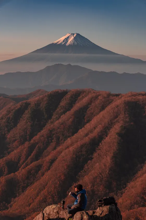 まず、近景から中景そして遠くに見える富士山に渡る山々のグラデーションが素晴らしいです。山々が重ならないよう撮影するにはカメラアングルが高い位置でなければなりません。写真下部の岩には山の色に溶け込みそうな感じですが、大自然を眺めながらコーヒーを飲む男性がいます。決して大きくはない人物が入ったことで、逆に山のスケール感を強調することになりました。コーヒーは登山者の疲れを癒す大切な存在であることが、この一枚から伝わってきます。誰でもが撮れる環境ではない場所での作品制作は努力と自然のコンディションが噛み合う中で生まれた作品と言えます。