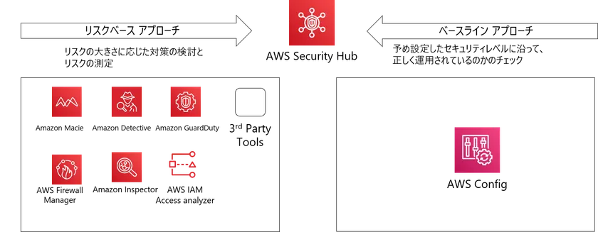 AWSには、それぞれのアプローチで測定するセキュリティサービスがあり、またその情報を集約するためのAWS Security Hubと呼ばれるサービスがあります。