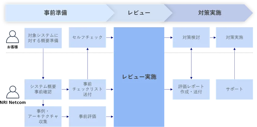 AWSアカウント セキュリティ対策支援サービスは、事前準備・レビュー・対策実施の3つのフェーズで提供いたします。期間は、標準パターンで1ヶ月間となります。
