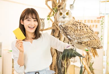 翼を広げると最大170cmにもなる、店内で一番“ジャンボ”なクゼンちゃん(♂・4歳)がお客様をお出迎え。幸運を呼ぶジャンボフクロウがジャンボな夢を運んできます!