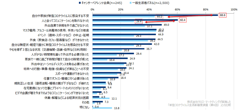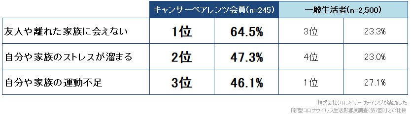 ● がん患者(キャンサーペアレンツ会員)は、「自分や家族がコロナウイルスに感染する不安」、「人と会ってコミュニケーションが取れなかった」ことに、一般生活者よりも強くストレスを感じている。<図1>さらに、今困っていることとして「友人や離れた家族に会えない」の回答が最も多い。<図2>