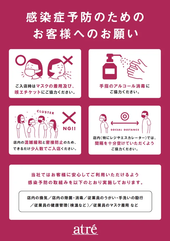アトレでは、お客さま、従業員及び関係者の皆様の安全性を考慮し、新型コロナウイルス感染拡大防止の為の対策を講じます。また、来店されるお客さまへのご協力のお願いがございます。