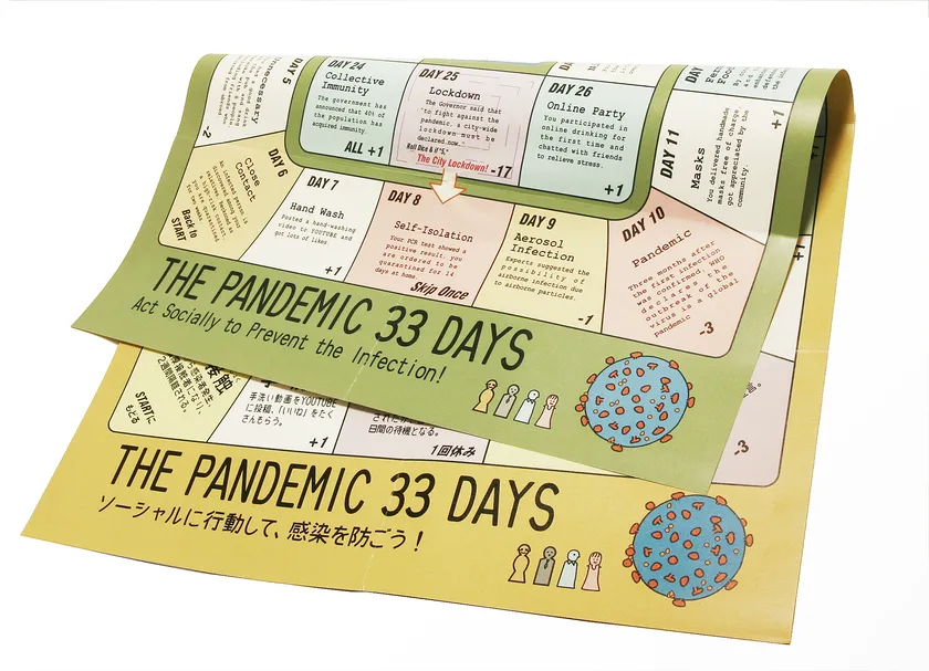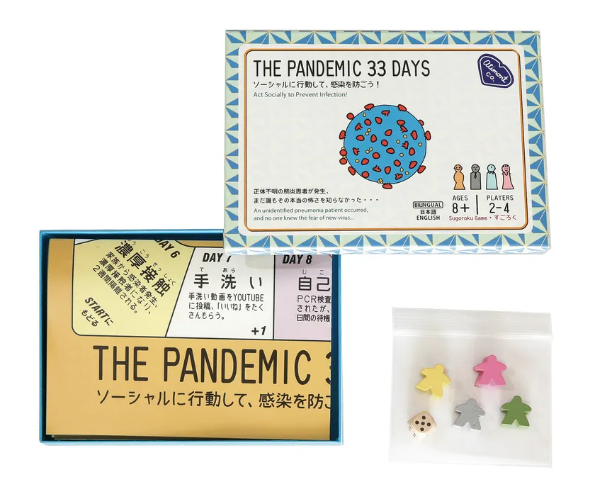「THE PANDEMIC 33 DAYS」は“新型肺炎が発生するニュース”からスタートし、“集団免疫達成!”でゴールするというゲーム展開。「ソーシャルディスタンス」「ロックダウン」「3密」といった新型肺炎の発生と同時に耳にするようになった30を超えるコロナ用語が自然と学べるゲーム構成に加え、「マスク」や「手洗い」といった基本的な感染予防の大切さ、「オンライン飲み」など明るい展望をもって対応することの大切さも感じられるなど、おうちライフでのストレス発散にも役立ちます。裏面は英語のバイリンガル仕様になっておりコロナ用語の英語表現を学んだり、海外の友人とのコミュニケーションなどにも活用できます。
