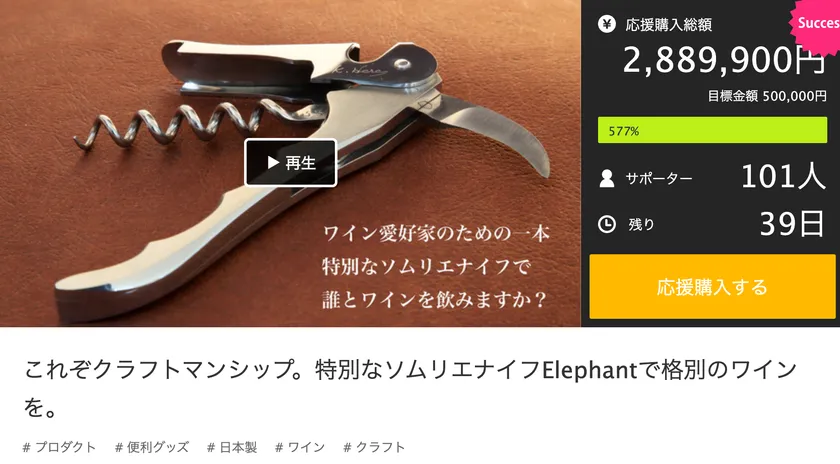 この度、有限会社ナイフハウスハラはハンドル、フック、スクリュー等、部品が全て手作りの2アクションソムリエナイフ「Elephant(エレファント)」を2020年9月14日よりクラウドファンディングサイトMakuakeにて公開し、1週間で280万円を超える資金調達に成功しました。