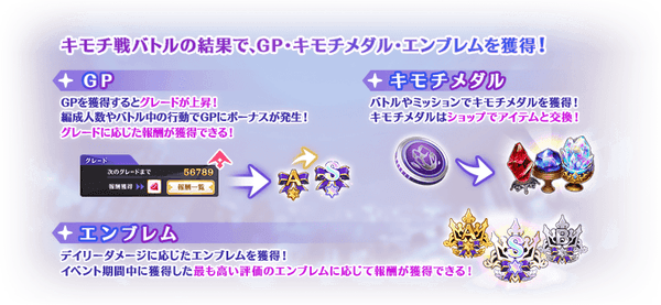 獲得した「エンブレム」が高位になるほど豪華報酬が獲得でき、「GP」が高いほど「キモチメダル」を多く獲得できます。「キモチメダル」はイベント限定ショップで「感情の欠片++」や「レインボーオーブ」等の貴重なアイテムと交換できます。