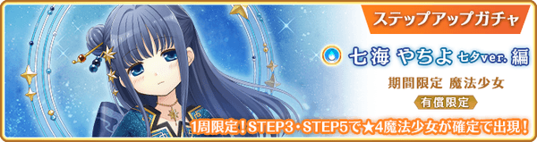 ※『有償限定 ステップアップガチャ 七海やちよ 七夕ver.編』の★4魔法少女確定までのカウントは『期間限定 七海やちよ 七夕ver. ピックアップガチャ』とは異なります。