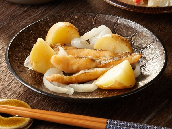 魚メニューでお客様よりご要望が多いのが、「骨なし」。カレイは特に小骨が多く、骨なしは海外加工ばかりの為、使用できなかったが、今回、本田水産で、食べやすく身だけにカットした(ロインカット)ものを、粉打ちまで行い、大阪でホテルや飲食店に食材と中食を製造卸をしている惣菜加工メーカーに、じゃが芋と玉ねぎを加えてソテーしました。淡泊な白身とじゃがいもにバターが溶けこんでいて、バターの香りがふんわり漂います。カレイは、良質のタンパク質を豊富に含んで、低脂肪で低カロリー。湯せんで温めるだけなので便利です。