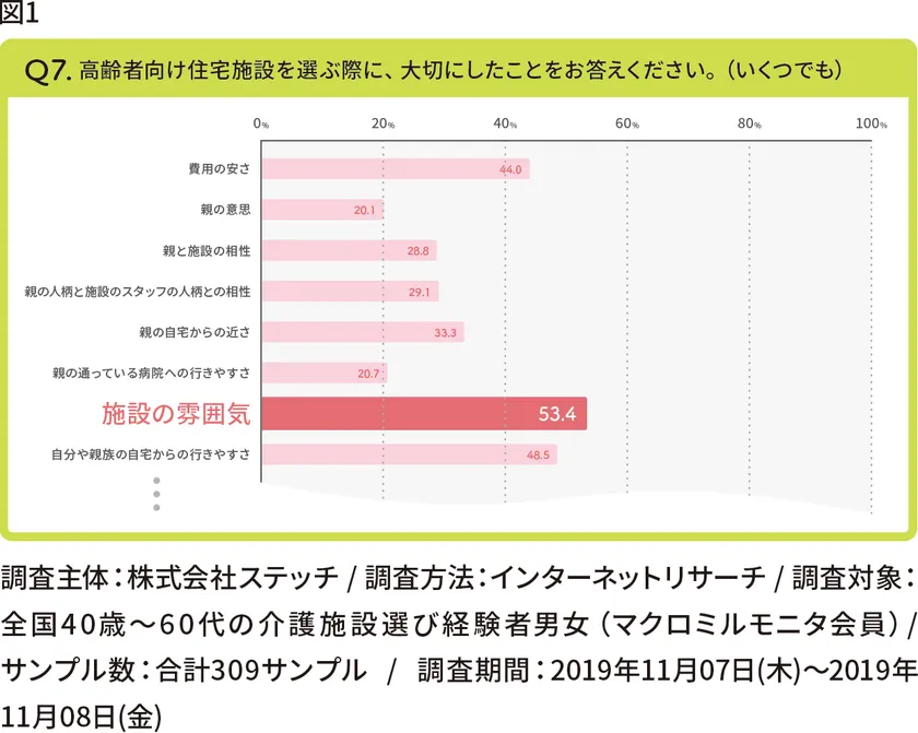 アンケート調査を行った結果、親の施設選びでもっとも多くの人が大切にしたのは、費用や立地ではなく、「施設の雰囲気」で、53.4%の人が選択しました(図1)。高齢者向け住宅施設における、雰囲気の重要性は、居住空間や対人関係などからも示されていますが(※1)、現在の施設紹介サイトでは雰囲気という観点は重要視されていません。