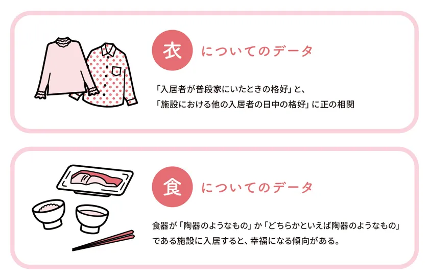 ・1,000件を超える実際の施設入居者のデータから、入居者にもっとも合う施設の雰囲気を分析してAIを構築。「入居者が普段家にいたときの格好」と「施設における他の入居者の日中の格好」が近いほど入居後の幸福度が高まる、などの結果を得た。