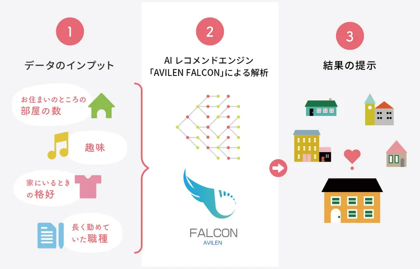 2. インプットしたデータを、AIレコメンドエンジンの「AVILEN FALCON」を用いて独自アルゴリズムで解析します。(「AVILEN FALCON」は、あらかじめ大量の施設や過去入居者のデータを用いて、学習させておきます。)