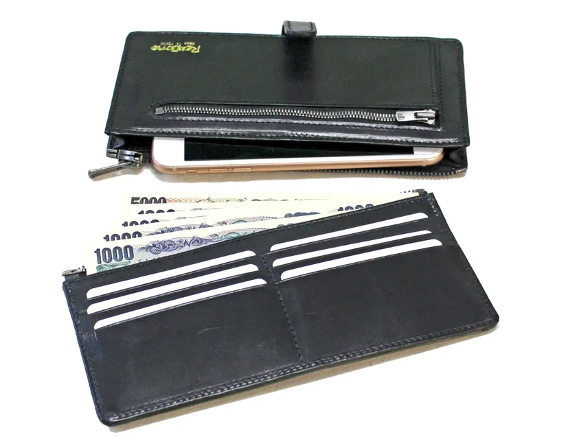 「カスタマイズできる財布」として考案され2016年に特許を取得した収納具で、中央のフラップで切り離して持つことも、カスタマイズすることも可能。尚且つ財布を閉じている状態でもラウンド財布のようにファスナーを開いて出し入れも可能な長財布です。
