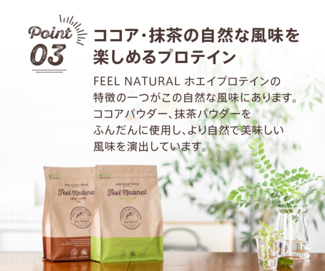 FEEL NATURAL ホエイプロテインは味にもこだわっています。ココアパウダー、抹茶パウダーをふんだんに使用して、より自然で美味しい味を実現しました。