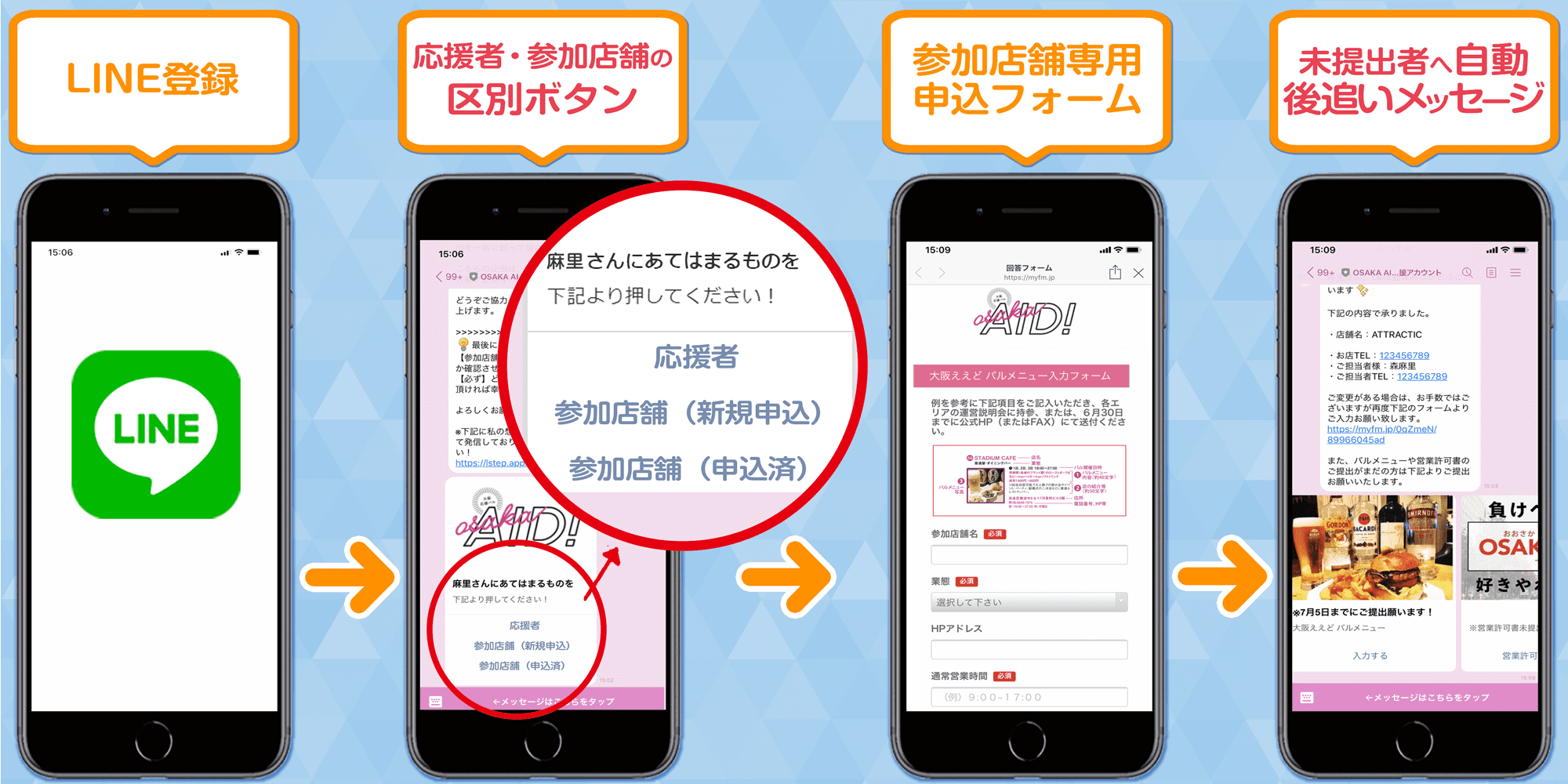 400店舗以上が参画するクラウドファンディング「大阪応援バル(OSAKA AID)」の店舗管理において、ATTRACTIC株式会社(本社:京都府京都市、代表取締役:森 麻里)が「LINE自動化」の仕組みを構築しました。クラウドファンディングとLINE公式アカウントの組み合わせという、SNSの力を駆使することでコロナ禍での非対面運営を実現しました。