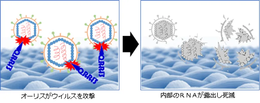 具体的には、衣料品に抗ウイルス加工剤「オーリス」を塗布・浸透させることで、生地に高い抗ウイルス性を持たせることが出来ます。「オーリス」はカチオン系の界面活性剤で、繊維にエンベロープウイルスが付着すると、オーリスがウイルスを攻撃し、ウイルス内部のRNAを露出させてウイルスを死滅させる効果を発揮します。