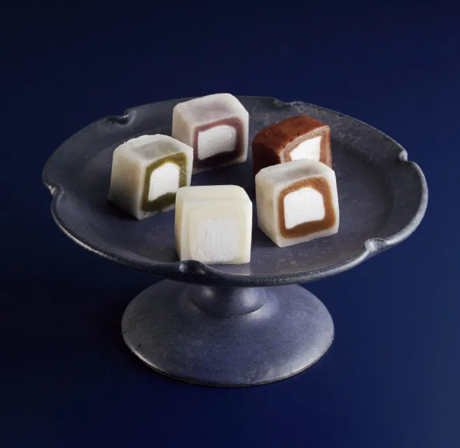 キューブ状の形状が見た目にも楽しいモチスイーツです。外側からもち、餡、生クリームの三層構造で、餡の部分は「あずき」、「珈琲」、「抹茶」、「生チョコ」に加え、爽やかなチーズの風味が特徴の近鉄限定フレーバー「レアチーズ」の5つの味が楽しめます。