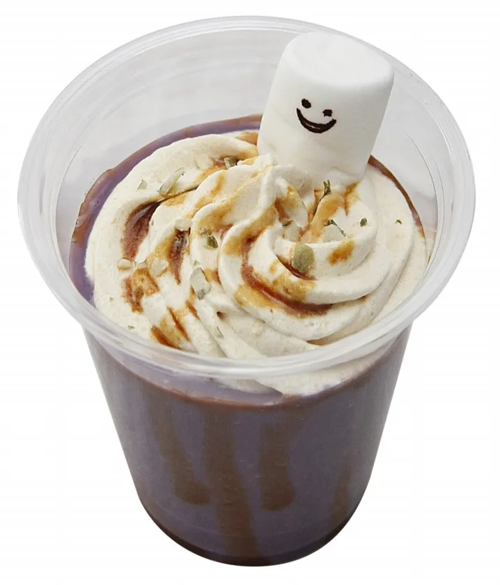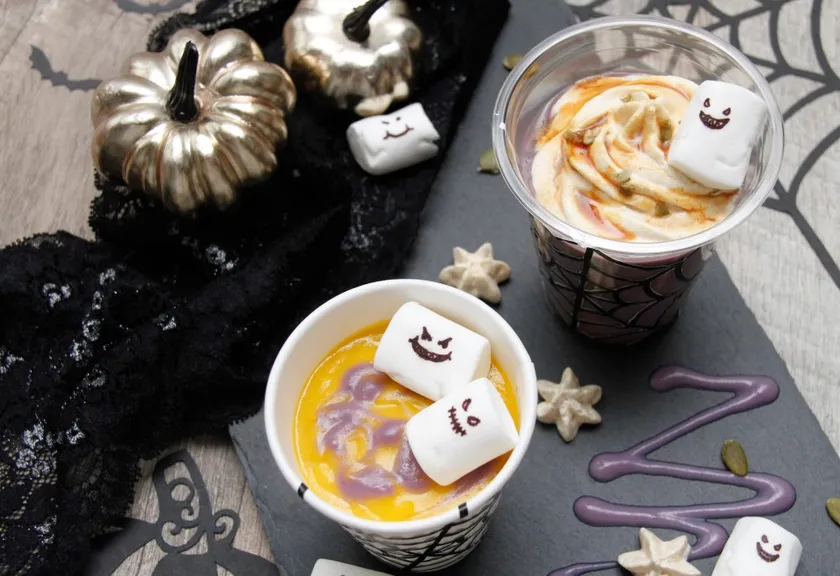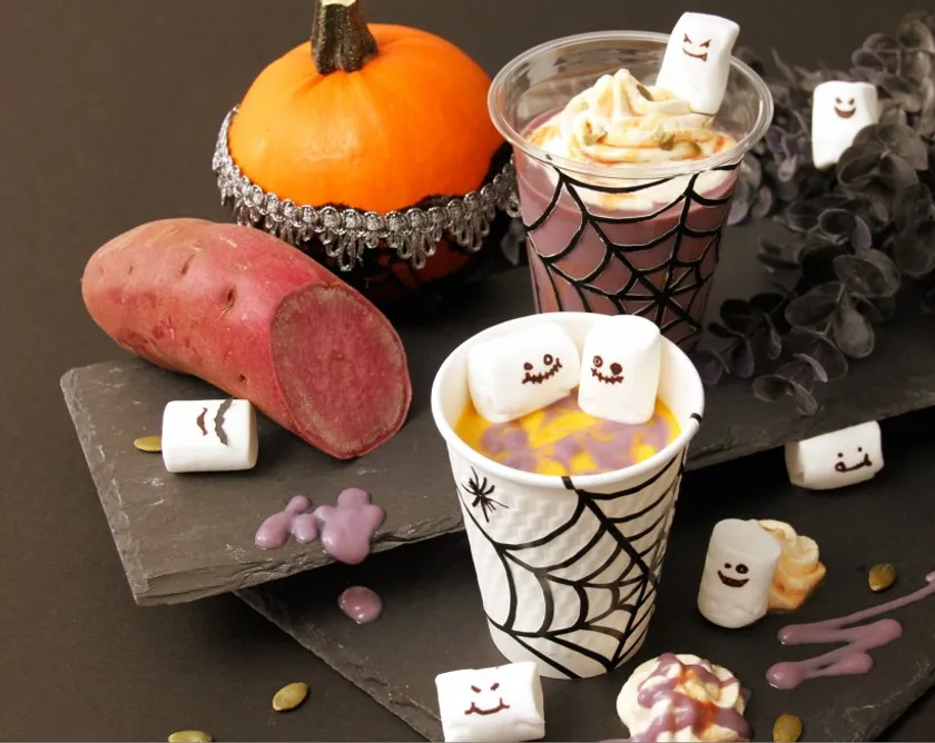 ベースのスムージーは豆乳・カボチャペースト・さつまいもを使用しており、メープルシロップで甘みをつけています。温かいスムージーなので甘みを強く感じられるスイーツのような満足感のある1杯です。スムージーの表面には、紫芋ペーストでマーブル状にデコレーションを施し、おばけのマシュマロを2個添えています。