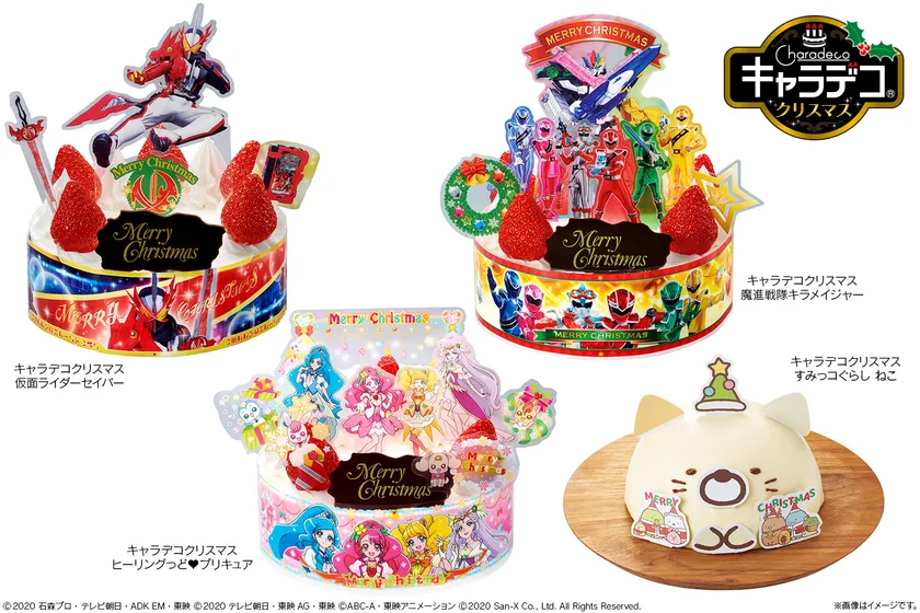 株式会社バンダイ キャンディ事業部は、人気キャラクターの「仮面ライダーセイバー」「ヒーリングっどプリキュア」「魔進戦隊キラメイジャー」のデザインを施した、デコレーションケーキシリーズ『キャラデコ』のクリスマスver.として『キャラデコクリスマス』(すべてオープン価格※)の予約受付を2020年9月下旬より、全国の量販店、コンビニエンスストア、洋菓子店にて順次開始します。