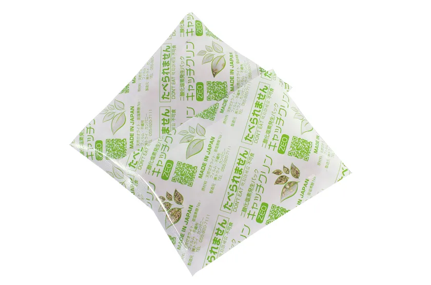 家のかたちをしたかわいい紙のパッケージの中に、二酸化塩素を含浸させた天然ゼオライトを詰めたシートが入っています。これが空気中の水分と炭酸ガスに触れて反応を始めることで、二酸化塩素がじわじわと発生する仕組みです。壁などに吊り下げることができ、置き場所の取りにくい空間などでお使いやすいタイプで、1シートで2か月ほど効果が持続します。