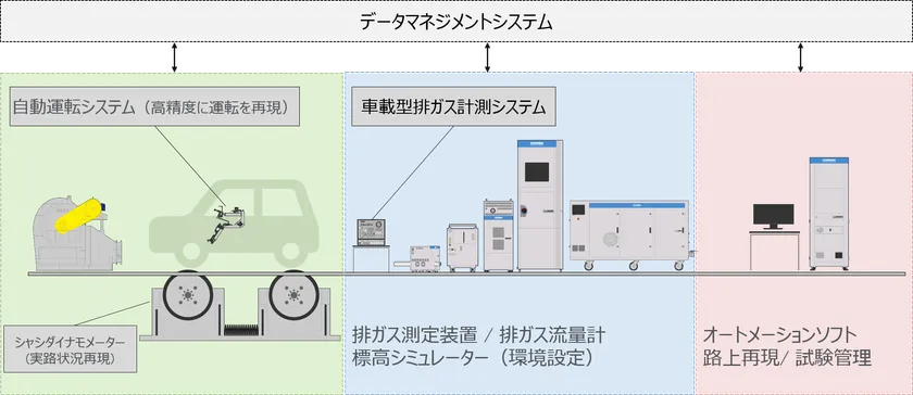 路上走行を再現するシャシダイナモメーター、自動運転システム、車載型排ガス測定装置などを、データマネジメントシステムで統合管理することで、路上走行試験を試験室内で高精度に再現します。