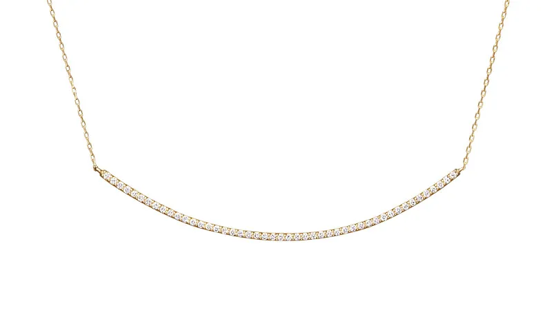 着ける人をやわらかに魅せる、カーブラインを備えたネックレス。上品ながら存在感ある瞬きで、胸もとを優しく彩ります。