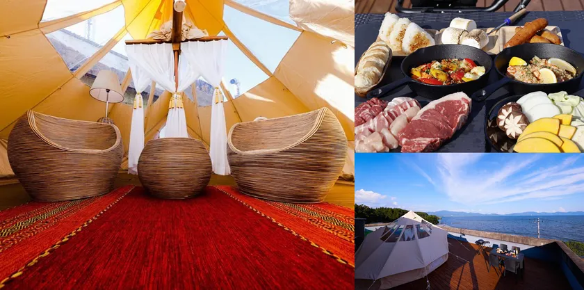 (左)バリ風グランピングテント内・(右上)プレミアムBBQコース・(右下)屋上からの景色