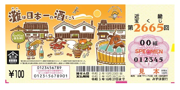 「日本一の酒どころ・灘五郷」を広く知っていただくため、ラッピングトレインと同じ「ほっこり和風テイストの猫のイラスト」を図柄とした近畿宝くじを発売します。