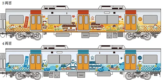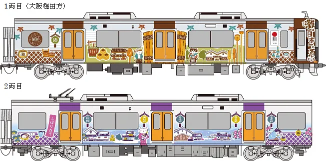 また、外装のラッピングだけでなく、車内には、「菰樽(こもだる)つり革」を設置し、座席側面にステッカーを貼るなど、外装と同様のイラストレーションでデザインすることで、乗車中も楽しめる“灘五郷一色”の列車として運行します。