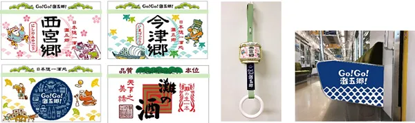 また、第1弾でご好評いただいた、ミニチュアの菰樽が付いた「Go!Go!灘五郷!」オリジナルのつり革を1車両当たり8本、1編成(6両)で計48本を設置します。菰樽のデザインは、灘五郷にある25の酒蔵のラベル(各1本)と、「Go!Go!灘五郷!」のロゴ等(7種類)の計32種類です。