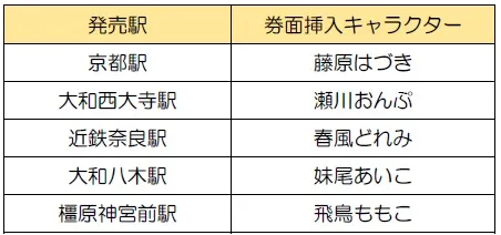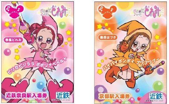 今回近鉄では、京都駅、近鉄奈良駅を含む5駅で「おジャ魔女どれみ」のキャラクターをデザインしたトレーディングカード型特製入場券を発売し、5駅分の入場券を集めた方にはオリジナルデザインの特製カードをプレゼントします。また、特製入場券発売駅5駅には等身大キャラクターパネルを新たに設置し、本年3月から実施している近鉄特急ビスタEXのタイアップ装飾を延長します。