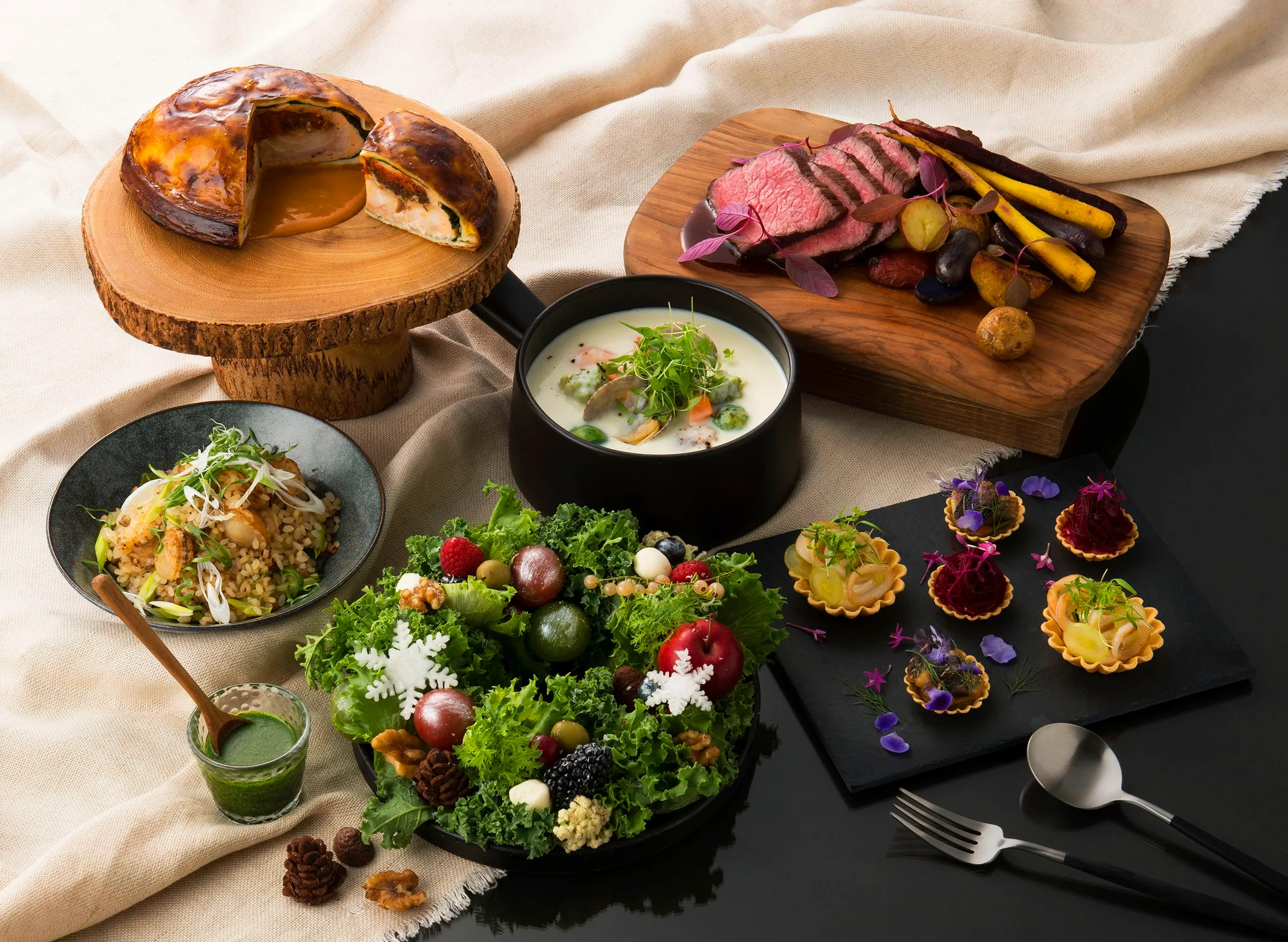 ヨーロッパの「乾杯の数だけ幸せになれる」ということわざをもとに、大切な人たちとの「A la vorte(乾杯)」をイメージし、「絶えることのない幸せ」を意味するスパークリングワインの泡モチーフや色とりどりに輝くケーキ49種の他、おうちで仕上げる豪華なDIYのデリ・オードブルなど、テーブルを華やかに彩るメニュー24種が揃いました。