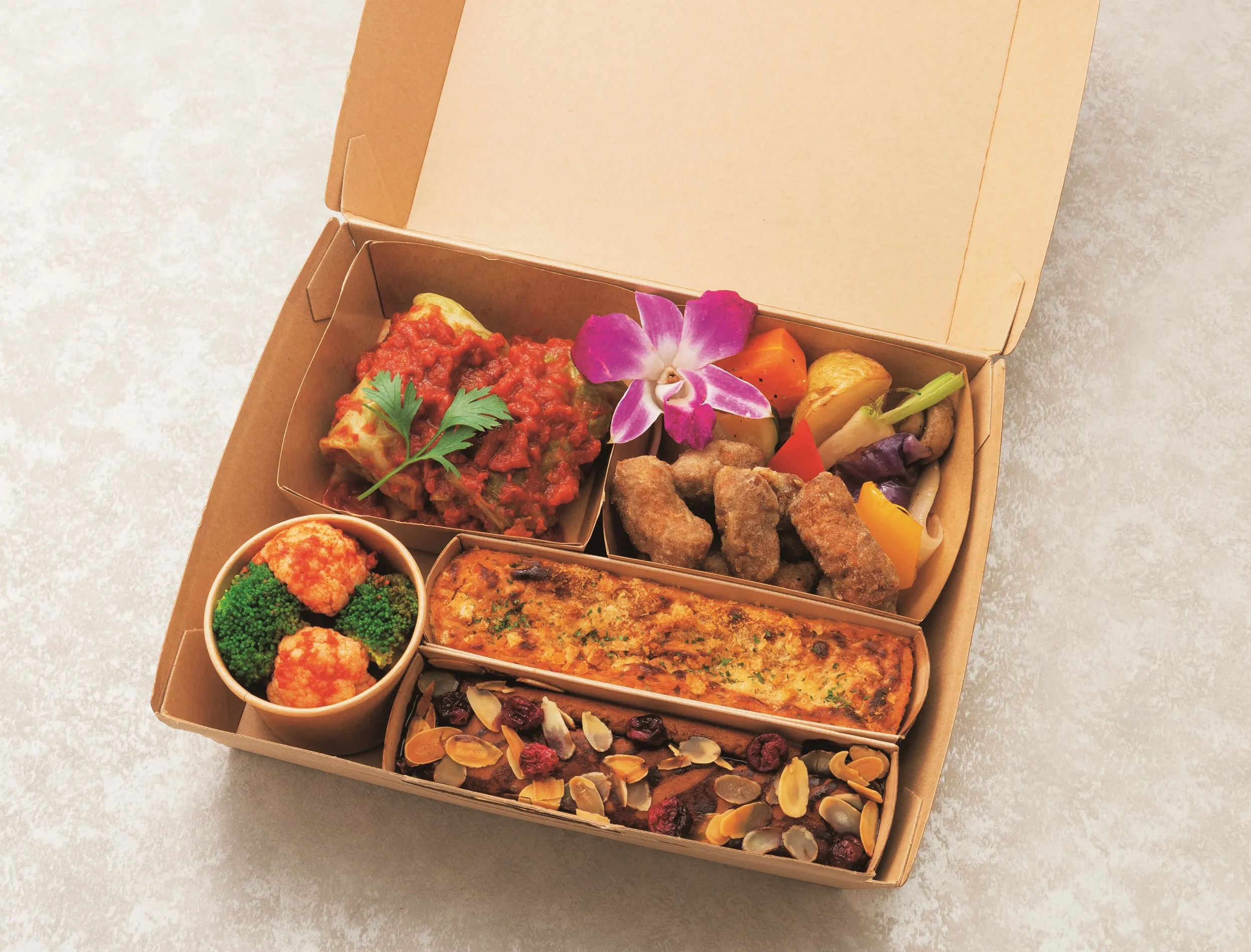 ヴィーガン専門店が提案するクリスマスオードブル。ロールキャベツ、モチコチキン、グラタン、ベリーモチケーキなどを詰めた豪華なセットです。