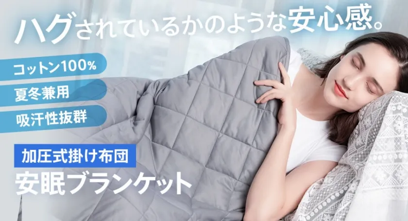 安眠ブランケットは、ナノガラスビーズ入りのブランケットで、その重さ(5-7kg)が体を適度に刺激し、ハグされているかの様な、幸福感と安心感を疑似体験することができます。その結果、包まれている心地よさで朝までぐっすり眠ることができます。