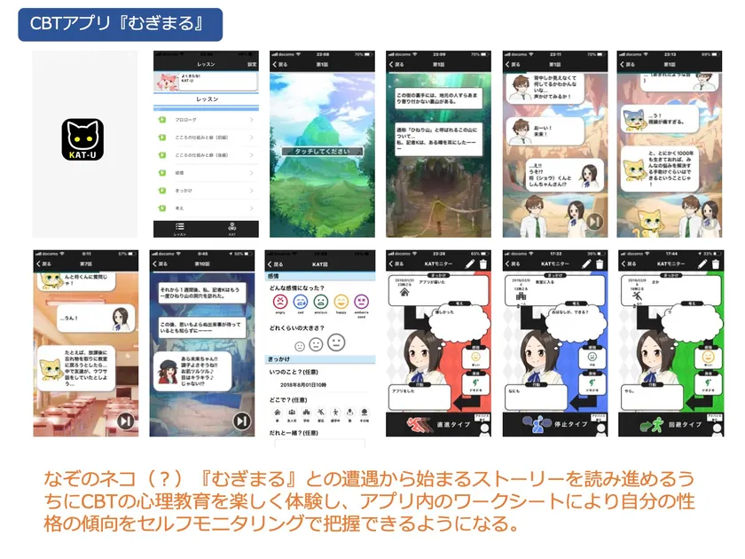 中高生でも親しみやすくアプリを利用できるように、ストーリー仕立てで楽しく心理教育と実践が受けられる『むぎまる』というアプリを開発し、CBTアプリとして利用していただきました。