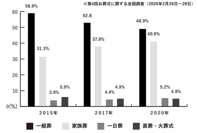 緊急事態宣言下では、三密回避のため直葬・火葬式が急上昇しています。その後は規制緩和の程度とともに減少傾向で、家族葬や一日葬を選択するご遺族が増加しています。